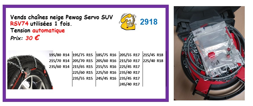 Vends chaînes neige PEWAG RSV74, utilisées une fois.