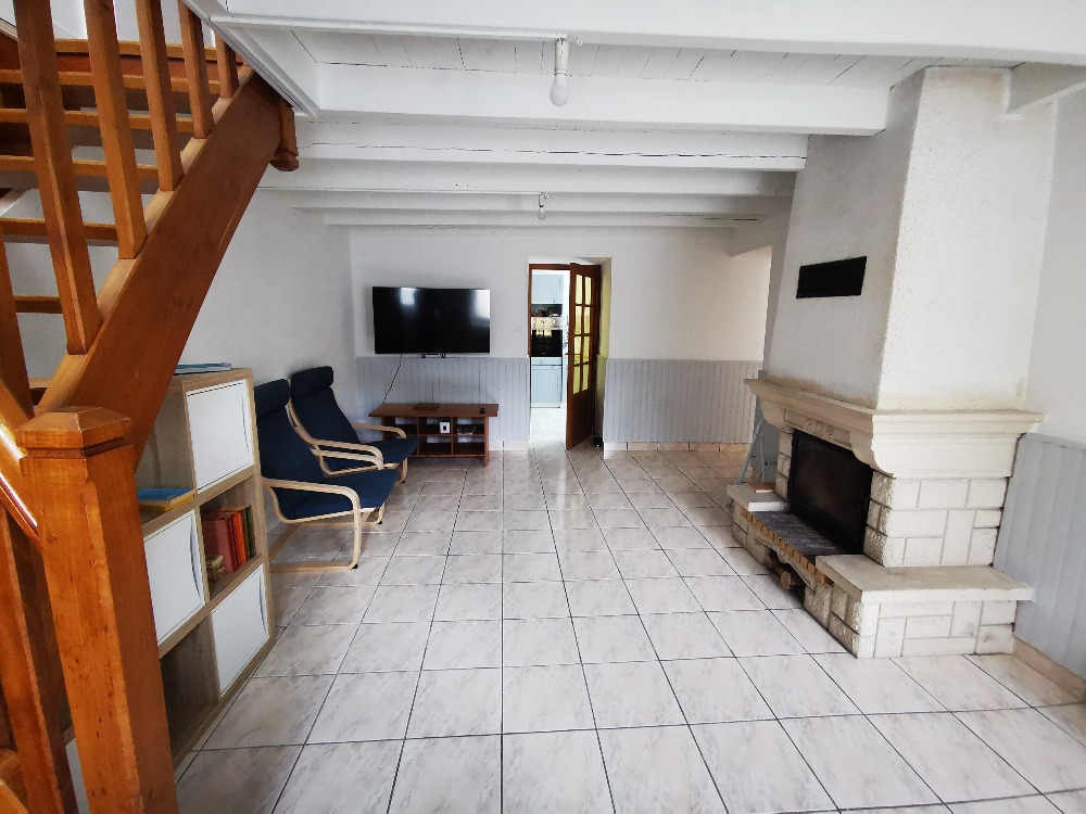 Maison mitoyenne de 74m². Au rdc : salon, salle à manger, cuisine et salle de bain. A l'étage, deux chambres en enfilade.