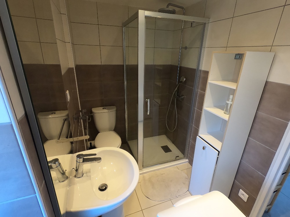 Le logement dispose d’une cuisine toute équipée, d’un salon/salle à manger et d’une salle de bain avec toilette.