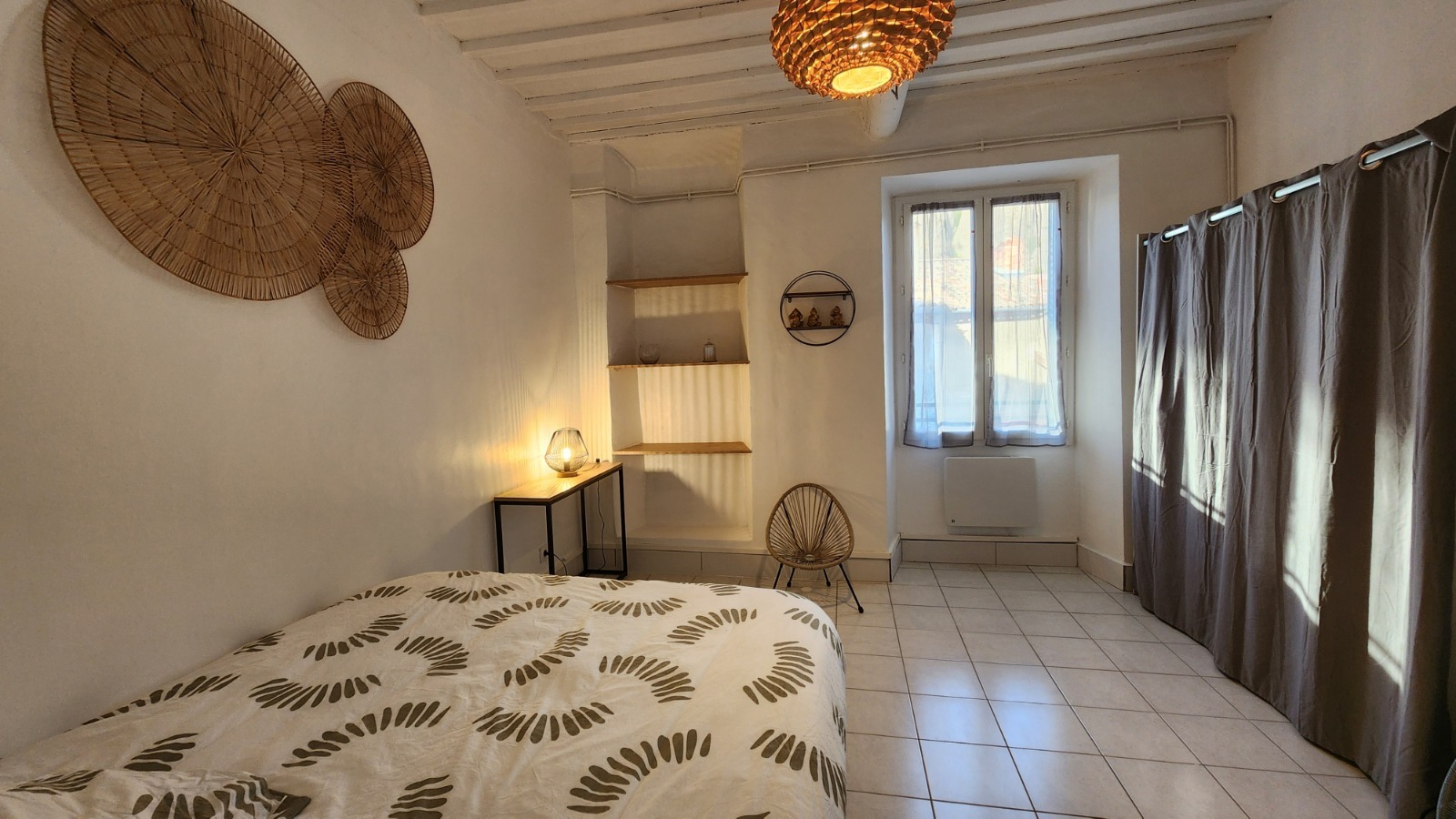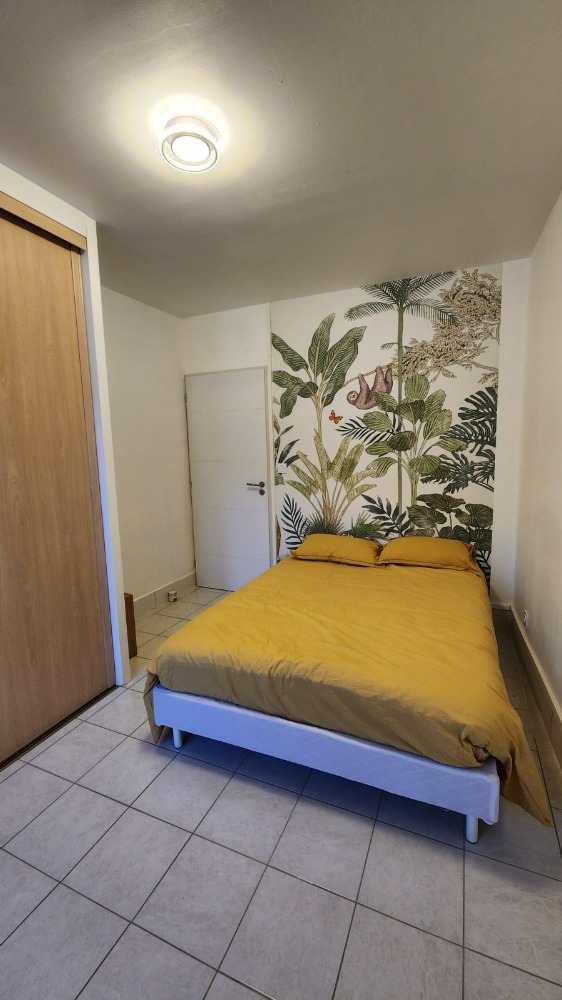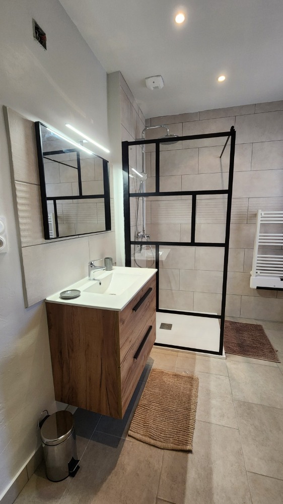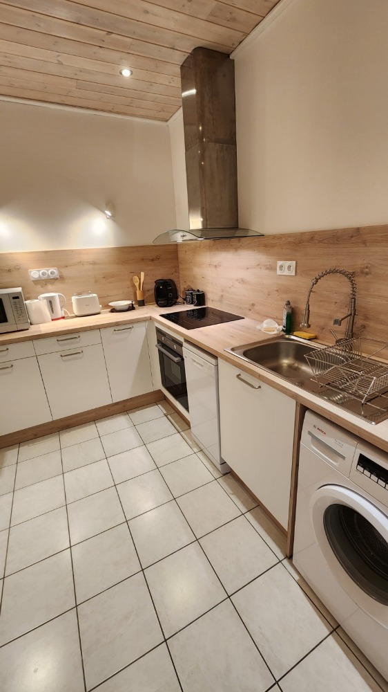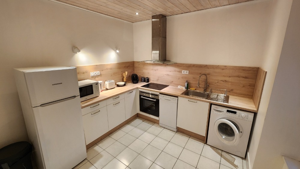Meublé complet : cuisine équipée avec lave-vaisselle, four, plaques de cuisson, réfrigérateur avec compartiment congélateur, vaisselle et ustensiles. Lave-linge, télévision, canapé, chambres avec lits doubles et rangements, salle de bain avec douche à l’italienne.